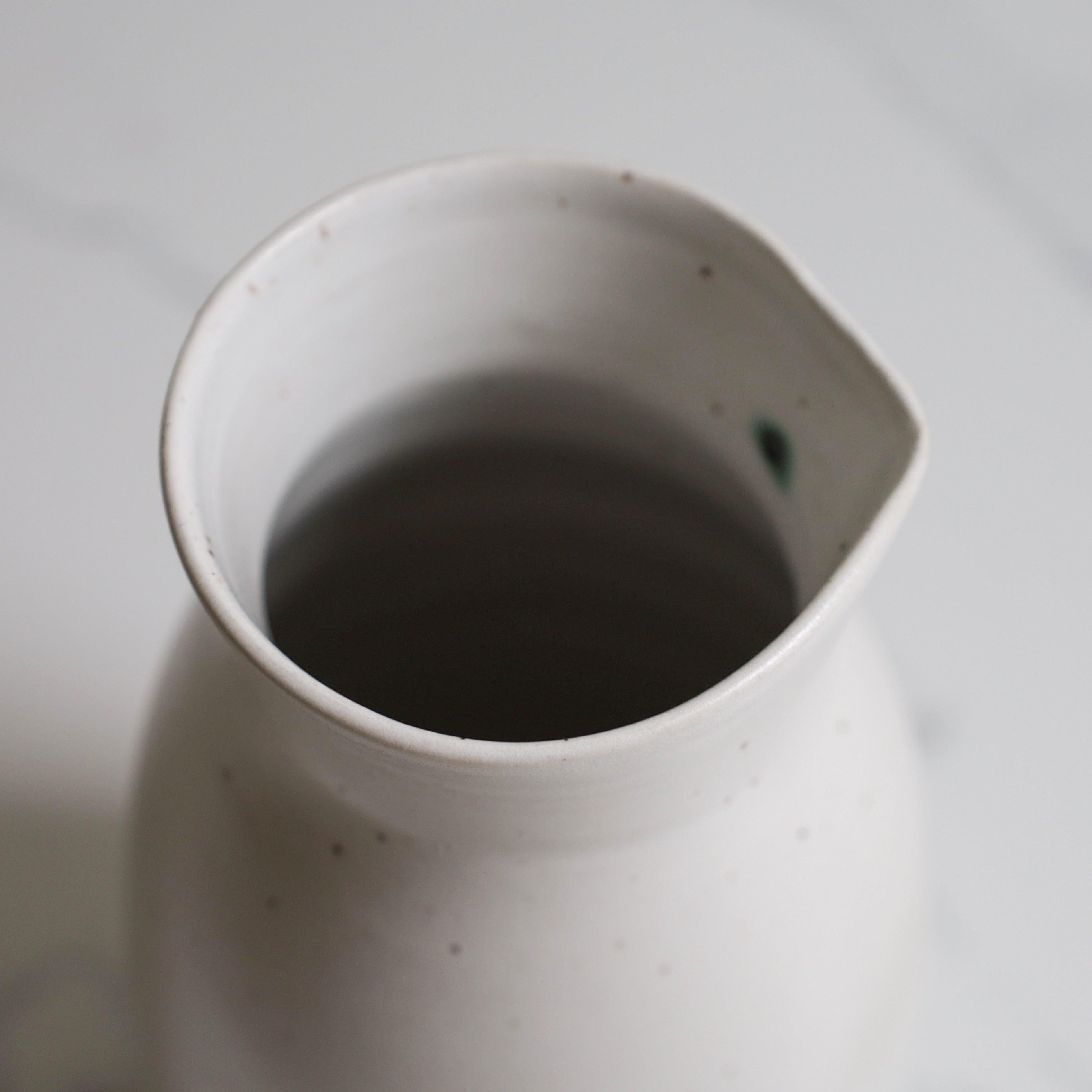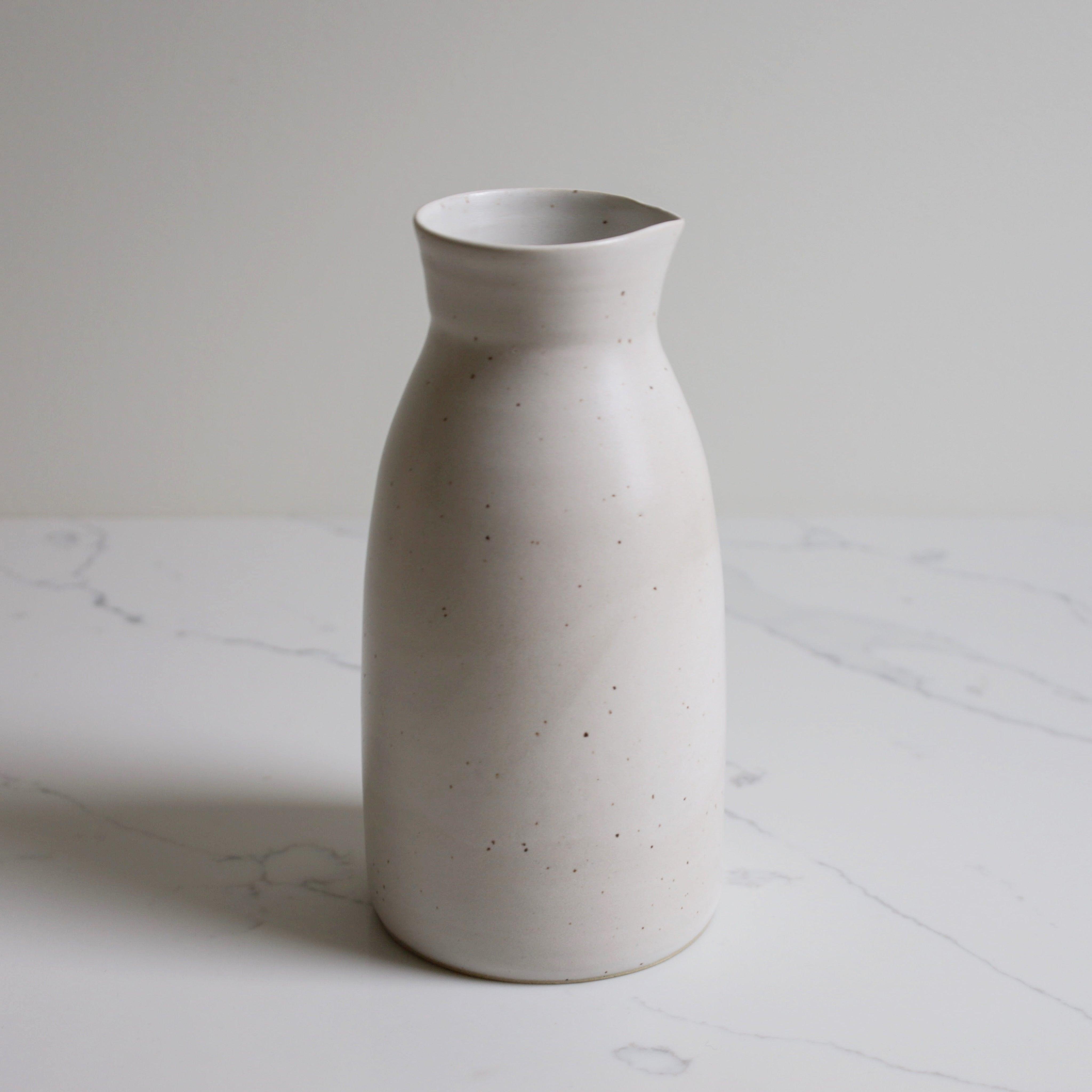 Minimalist lines in a soft matte white ceramic make this carafe a versatile addition to service ware. Delicate, yet sturdy, each is unique in a timeless design that can be enjoyed for generations.
